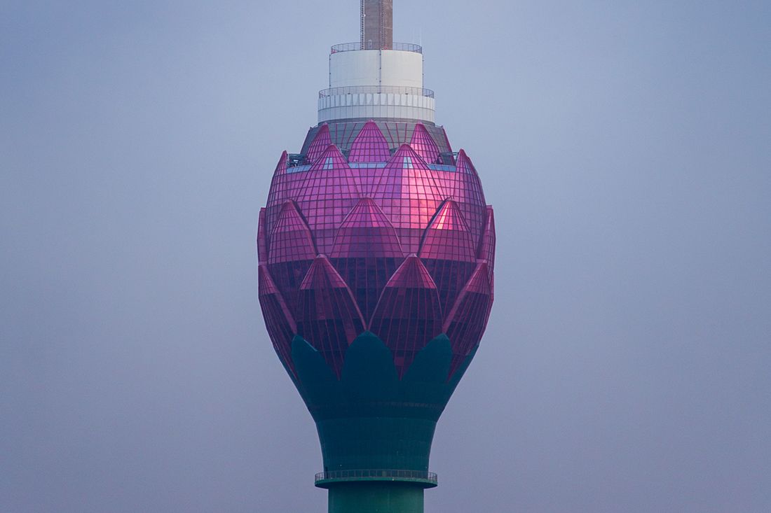 Entsprechend seines Namens ist der Turmkorb in Form einer geschlossenen Lotusblüte gestaltet. Seine Glasfassade ist passend zu den Blüten der Lotuspflanze in Rosa gehalten, während der eigentliche Turmschaft dem kräftigen Opal-Grün des Pflanzenstils entspricht.