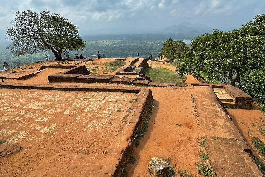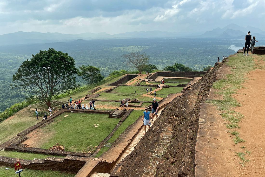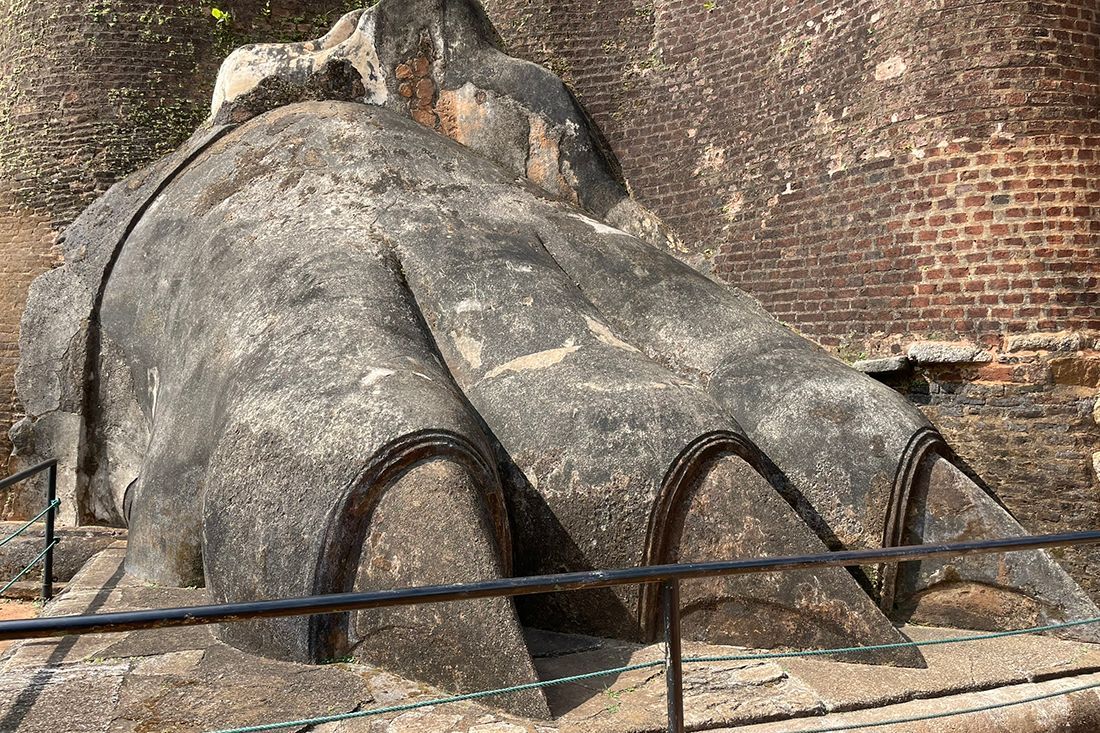 Man besteigt den Felsen von der Nordseite her durch das Löwentor. Zu früheren Zeiten soll sich hier ein riesiger, aus den Stein gemeißelter Löwenkopf befunden haben und man musste zunächst durch dessen weit geöffnetes Maul laufen, um die Anlage zu besteigen. Heutzutage sind nur noch die zwei Vordertatzen des Löwen erkennbar. Von hier aus führt eine Treppe steil nach oben. Bis dorthin wird man seit dem Parkplatz und Eingang der Anlage insgesamt knapp 1.200 Stufen zurückgelegt haben. Auf dem Plateau befand sich früher das prächtige Palastgebäude von König Kassapa I. Heutzutage sind nur noch dessen Grundmauern und einige Zisternen erkennbar. Von hier oben aus hat man einen grandiosen 360 Grad Blick über den umliegenden Urwald.