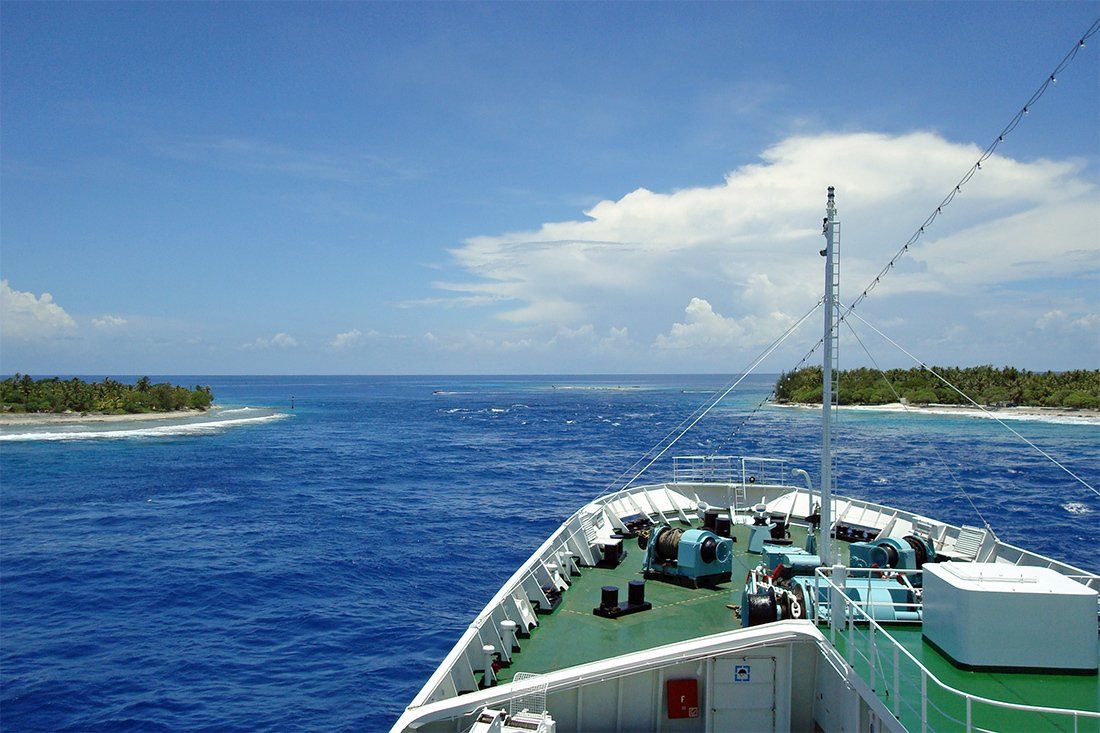Sonnenaufgang ist heute bereits um 05:42 Uhr. Seit dem Verlassen von Pitcairn wurden die Uhren an Bord erneut zweimal um jeweils eine Stunde zurückgestellt. Der Zeitunterschied zu Deutschland beträgt nun minus elf Stunden. Das bedeutet, dass es in Deutschland elf Stunden später ist als an Bord. Nach zwei entspannten Seetagen steht heute Mittag wieder einmal eine Anlandung auf dem Programm. Wir werden zur Mittagszeit Französisch-Polynesien erreichen und im Rangiroa Atoll auf dem Tuamotu Archipel ankommen. Am heutigen Vormittag wird im Maxim Theater der Dokumentarfilm „TS HAMBURG – Der Bau der heutigen Maxim Gorki“ gezeigt. Die interessante Geschichte unseres „schwimmenden Zuhauses“ wird mit vielen historischen Aufnahmen ausführlich erläutert. Ansonsten ist es ein recht ruhiger und entspannter Vormittag. Heute werden kaum noch Kurse und Animationsprogramme angeboten. Kurz vor 13:00 Uhr, nach dem Mittagessen, nähern wir uns dann aus nordöstlicher Richtung kommend dem Rangiroa Atoll. Die Farben des Meeres, des Himmels, des Strandes sowie der Palmen könnten kaum klischeehafter sein. Südsee par excellence. Direkt vor uns liegt der Tiputa Pass, eine von zwei schiffbaren Einfahrten in die Lagune auf der Nordseite des Rangiroa Atolls.