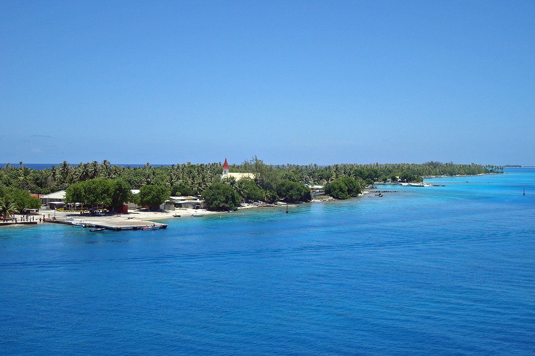 Im Inneren der Lagune sehen wir den kleinen Anleger von Tiputa, die Kirche sowie einige Gebäude.