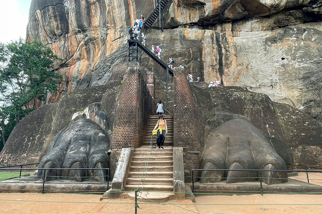 Man besteigt den Felsen von der Nordseite her durch das Löwentor. Zu früheren Zeiten soll sich hier ein riesiger, aus den Stein gemeißelter Löwenkopf befunden haben und man musste zunächst durch dessen weit geöffnetes Maul laufen, um die Anlage zu besteigen. Heutzutage sind nur noch die zwei Vordertatzen des Löwen erkennbar. Von hier aus führt eine Treppe steil nach oben. Bis dorthin wird man seit dem Parkplatz und Eingang der Anlage insgesamt knapp 1.200 Stufen zurückgelegt haben. Auf dem Plateau befand sich früher das prächtige Palastgebäude von König Kassapa I. Heutzutage sind nur noch dessen Grundmauern und einige Zisternen erkennbar. Von hier oben aus hat man einen grandiosen 360 Grad Blick über den umliegenden Urwald.