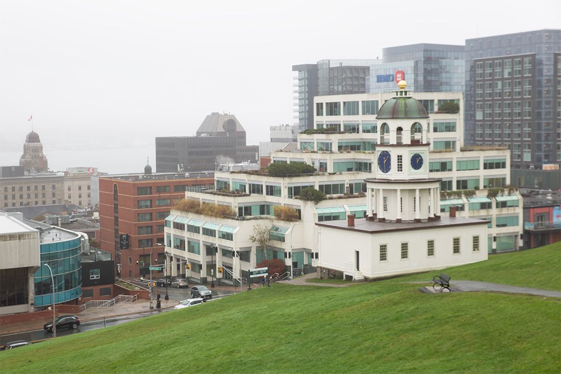 Eigentlich hätte man von hier oben einen schönen Panoramablick auf die Stadt und den Hafen. Doch heute spielt das Wetter leider nicht mit. Einzig der am 20.10.1803 in Betrieb genommene Uhrturm von Halifax, die Old Town Clock, ist gut erkennbar. Prinz Edward Augustus, Duke of Kent and Strathearn, hatte seinerzeit die Idee und wollte mit der großen und gut sichtbaren Uhr die Unpünktlichkeit der Soldaten eindämmen.