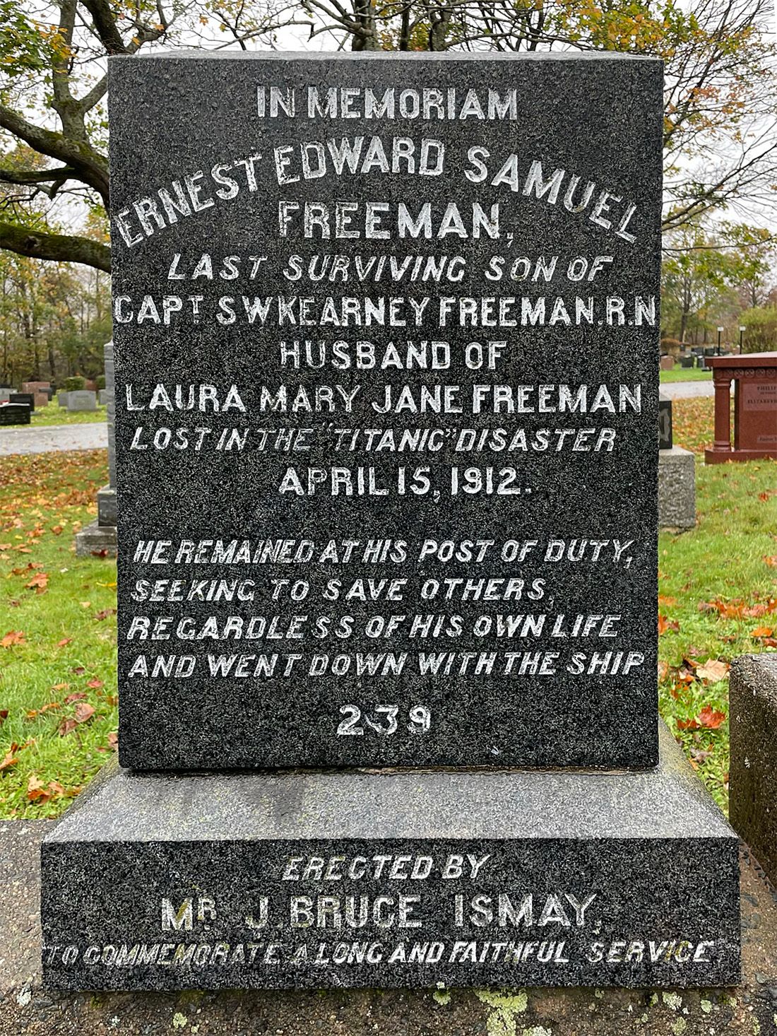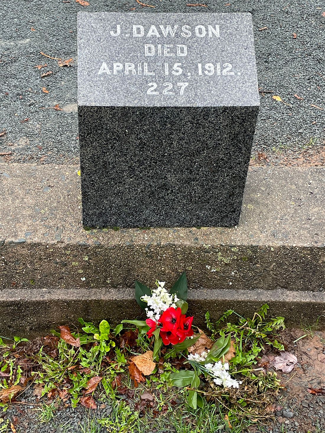 Wir fahren nun zum Fairview Cemetery. Hier sind 121 der insgesamt 1.500 Opfer des Unterganges beerdigt. Die Grabstelle sieht aus der Luft betrachtet wie der spitzzulaufende Bug eines Schiffes aus. Alle Grabsteine tragen im unteren Bereich eine Nummer. Hierbei handelt es sich um die jeweilige Nummerierung entsprechend der damals fortlaufend geführten Liste der Todesopfer.