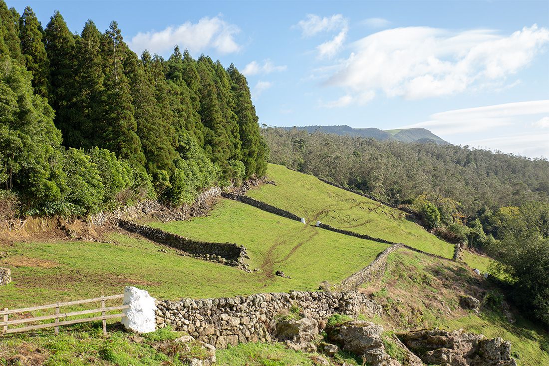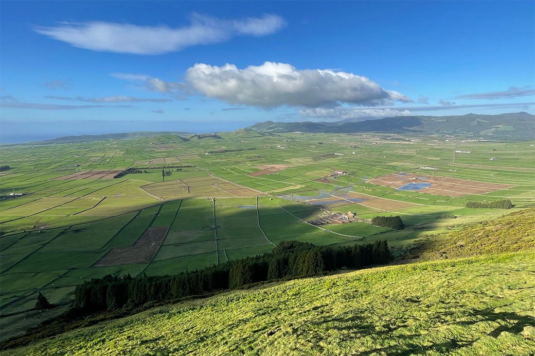 Die Fahrt führt weiter in Richtung Inselmitte. Der nächste Stopp ist an der Caldeira de Guilherme Moniz, einem 15km breiten Krater, der sich Richtung Süden zum Meer hin geöffnet hat. Auch hier ist die landwirtschaftliche Nutzung allgegenwärtig.