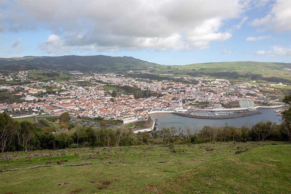 Die Fahrt geht nun bergab Richtung Südküste. Wir erreichen schließlich die Halbinsel der Stadt Angra do Heroismo und passieren an deren schmalste Stelle das mächtige Castelo de São João Baptista. Die Fahrt führt über Serpentinen hinauf auf den 205 Meter hohen Monte Brasil. Von hier oben haben wir einen grandiosen Ausblick auf Angra do Heroismo.