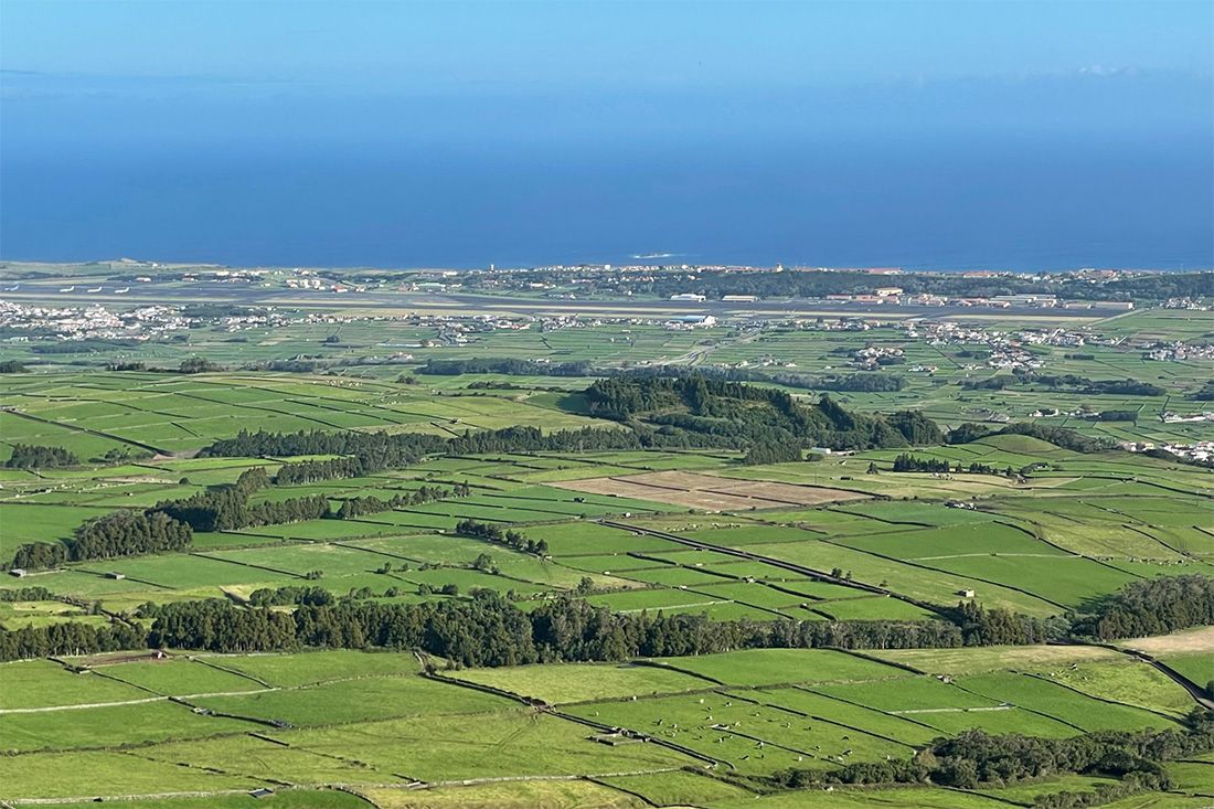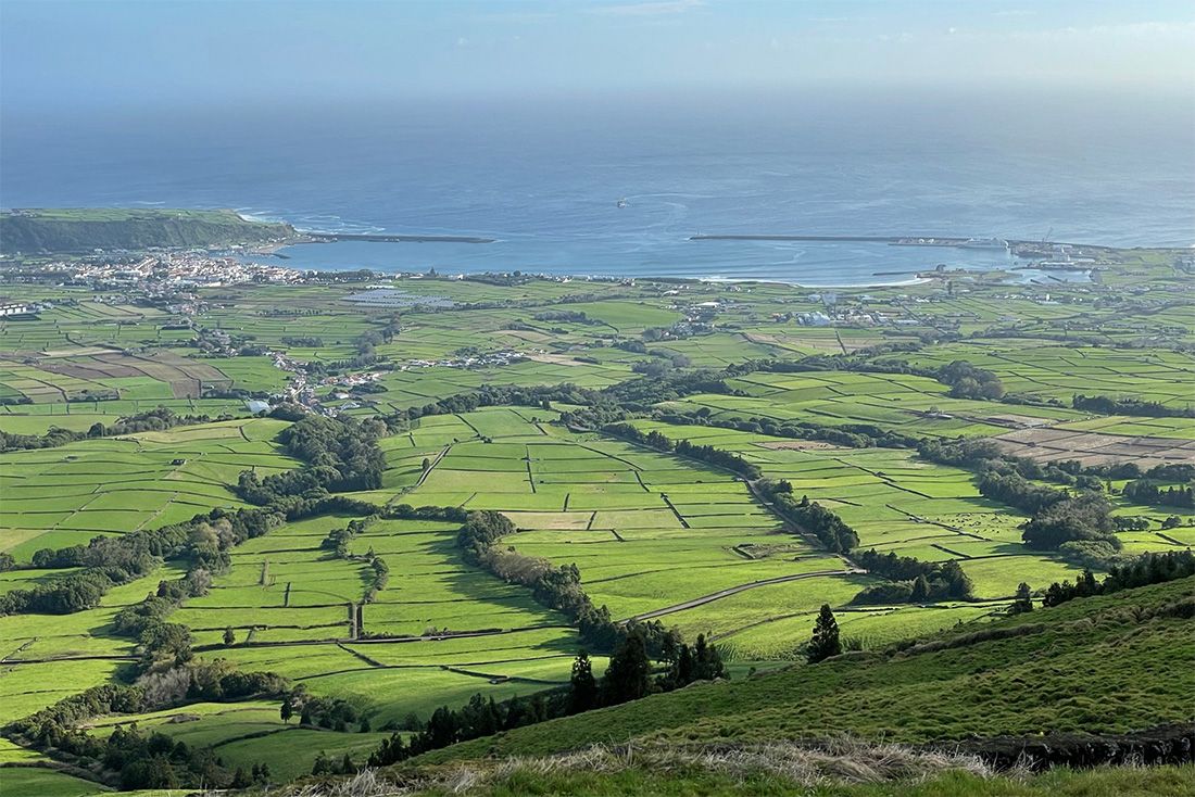Der Blick schweift weiter Richtung Westen und Südwesten. Nun erkennt man besonders gut die landwirtschaftliche Nutzung der Insel. Die Felder sind durch schwarze Steinmauern und große Hortensienhecken gitterförmig aufgeteilt.