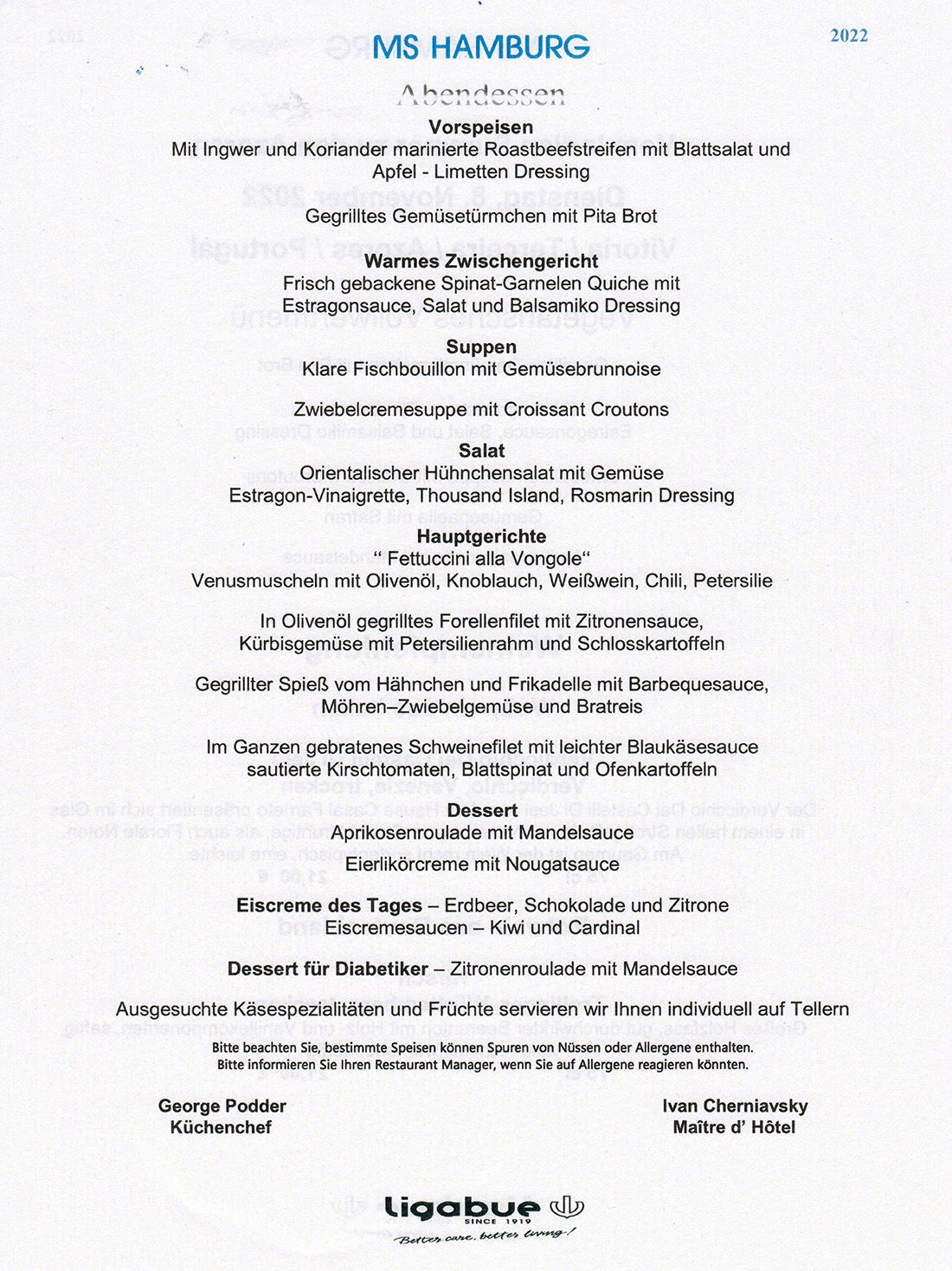 Zwischen 22:30 und 23:15 Uhr werden in allen Bars nochmals Pastéis de Bacalhau als Late-Night-Snack gereicht. Nach einem letzten Drink begeben sich die meisten Gäste dann auf die Kabinen, um ihre Koffer für die morgige Abreise zu packen.