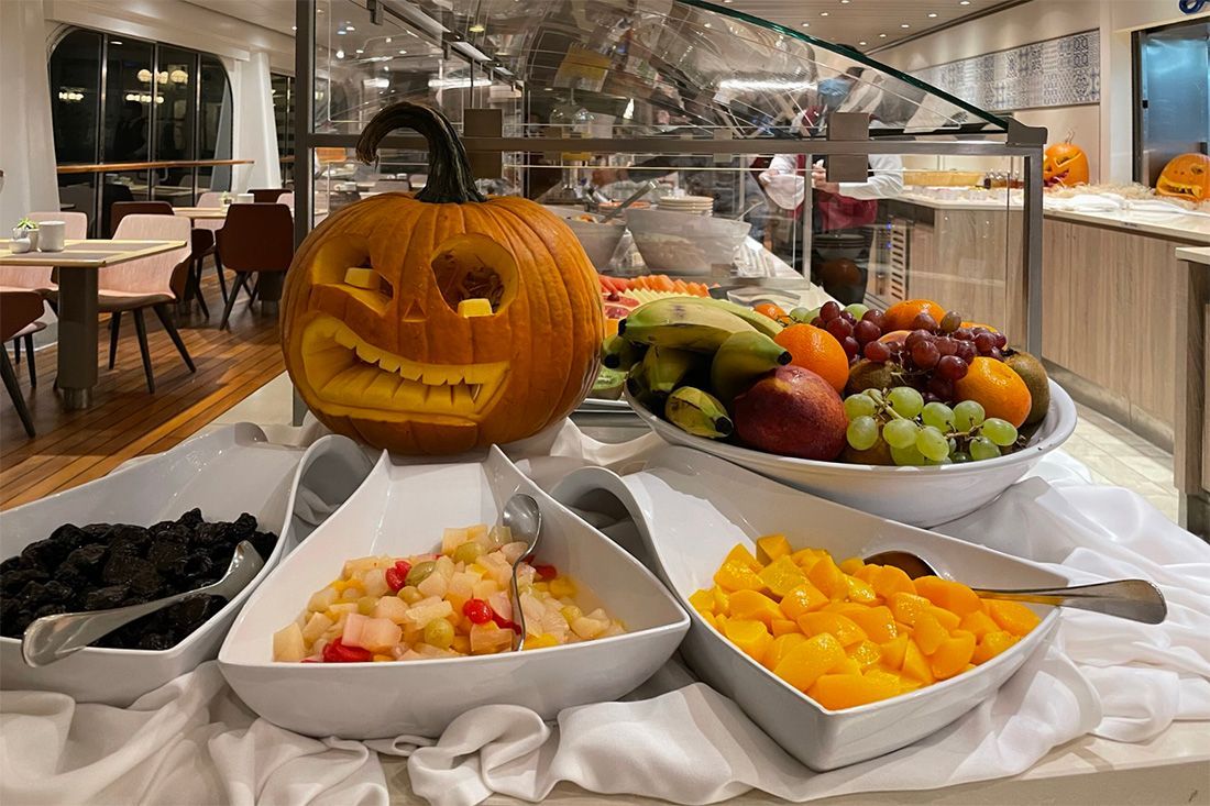Heute ist der 31. Oktober, Halloween. Selbstverständlich wird auch diese alte Tradition an Bord der MS HAMBURG begangen. Die katholisch geprägten irischen Einwanderer brachten diesen Brauch seinerzeit mit auf den amerikanischen Kontinent, wo seither All Hallows´Eve, der Abend vor Allerheiligen, gefeiert wird. Passend dazu befindet sich die MS HAMBURG derzeit ja auch in der Region, in der die Besiedlung des amerikanischen Kontinents durch die Europäer begann. Schon zum Frühstück begegnen uns an den Buffets der Restaurants unzählige liebevoll geschnitzte Kürbisse.