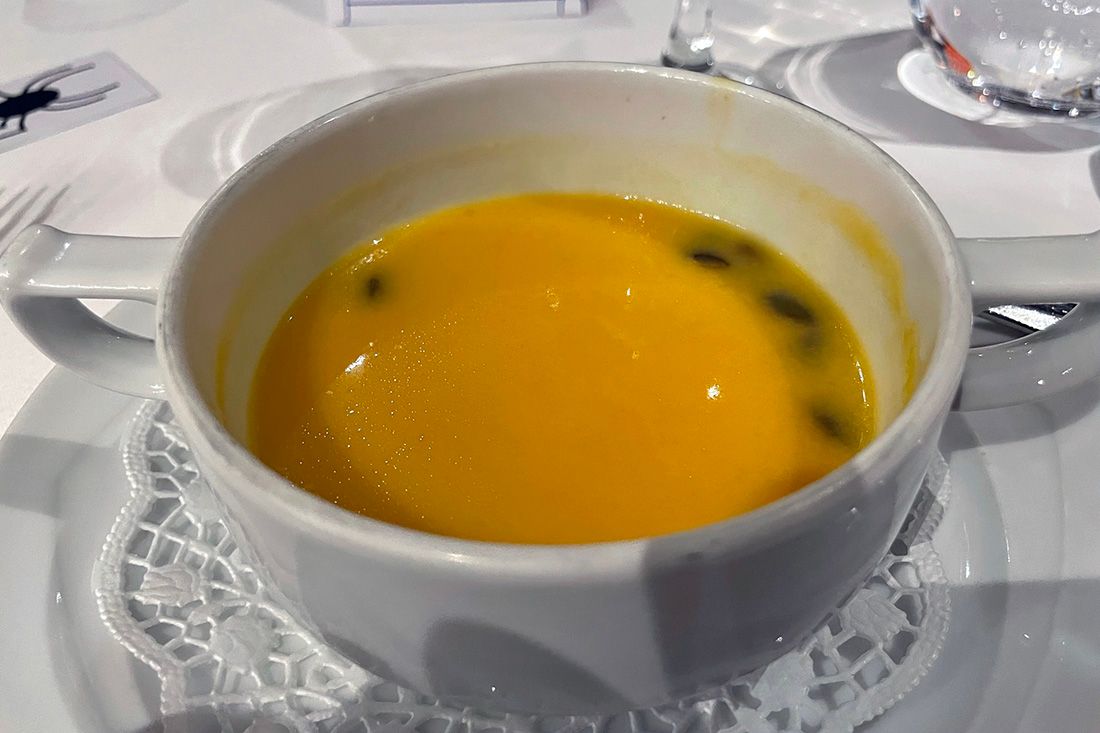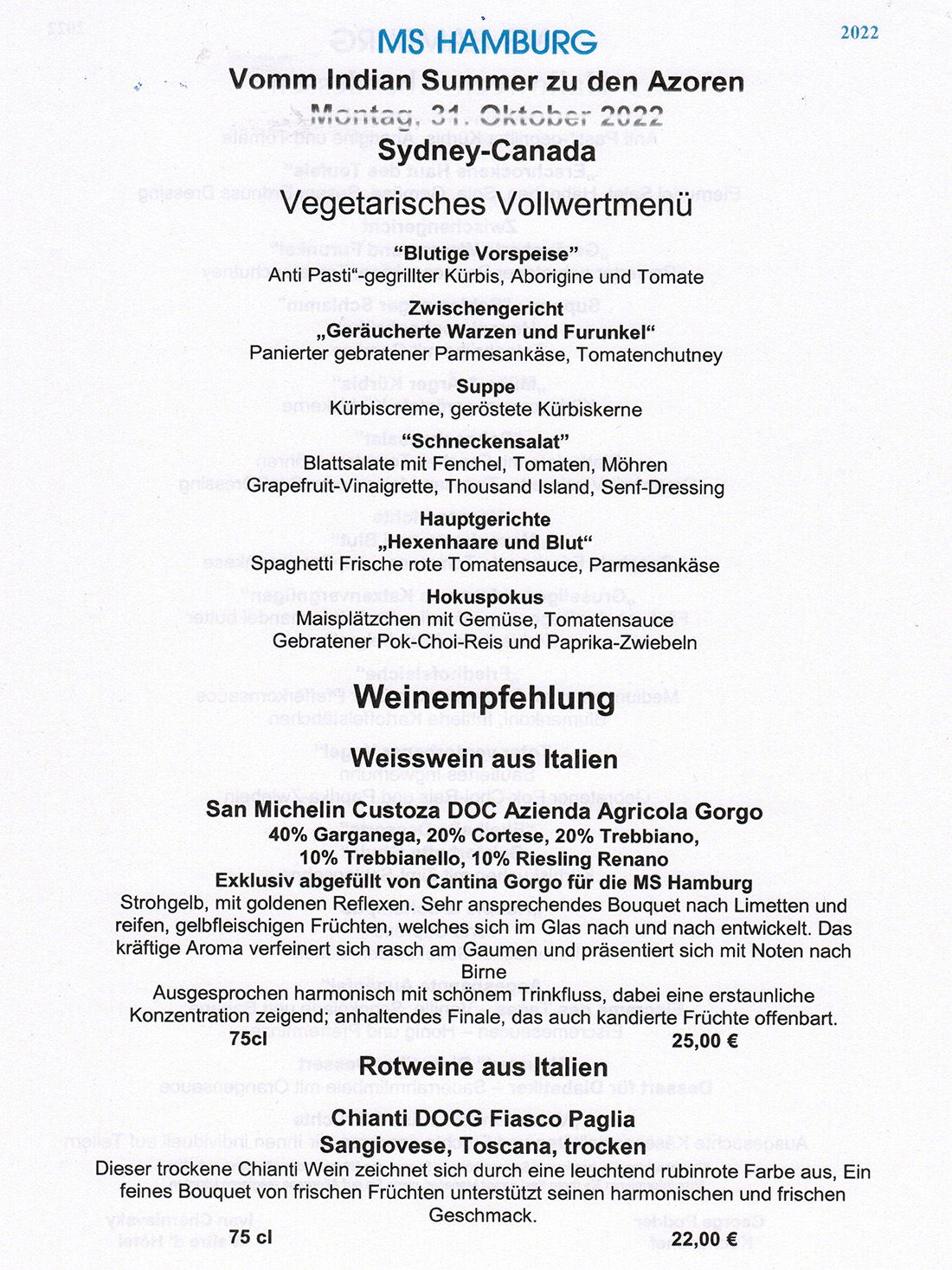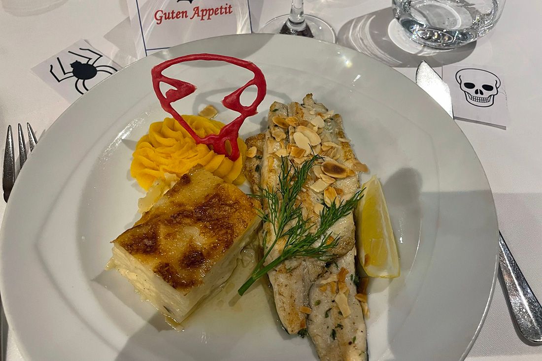 Um 19:00 Uhr öffnen die Restaurants zum heutigen Halloween-Abendessen. Passend dazu haben sich die Stewardessen und Stewards gespenstisch-furchteinflößend gekleidet und geschminkt.