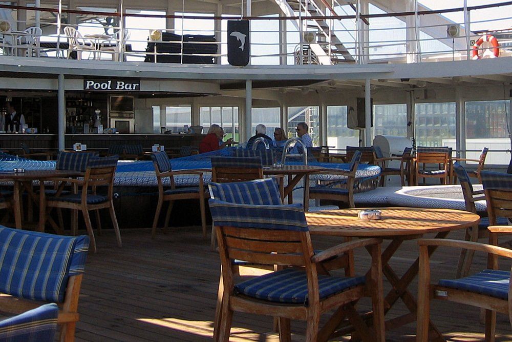 Von der Lido-Bar gelangt man weiter Richtung achtern zur Pool-Bar und dem großzügigen Außenbereich. Dieser ist von einem riesigen Sonnensegel überdacht und bietet bei Schatten reichlich Sitzmöglichkeiten. Das kuppelförmig gewölbte Sonnensegel versperrt allerdings den direkten Blick vom, ein Deck höher gelegenen, Brückendeck auf das Kielwasser.