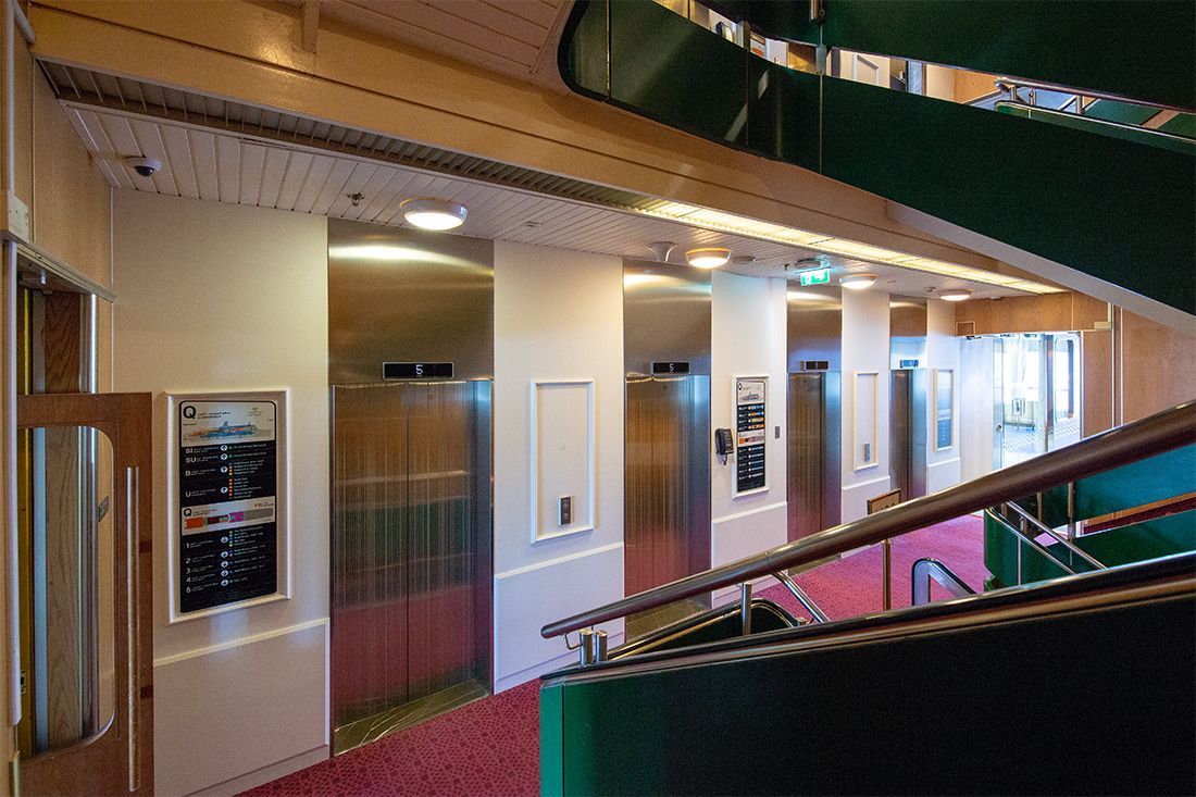 Lobby zwei Treppenhäuser an. Bugwärts befindet sich ein kleineres Treppenhaus (Stairway C), welches über einen einzelnen Aufzug verfügt. Richtung achtern befindet sich das deutlich größere Treppenhaus (Stairway D), welches mit zwei Aufzügen ausgestattet ist.